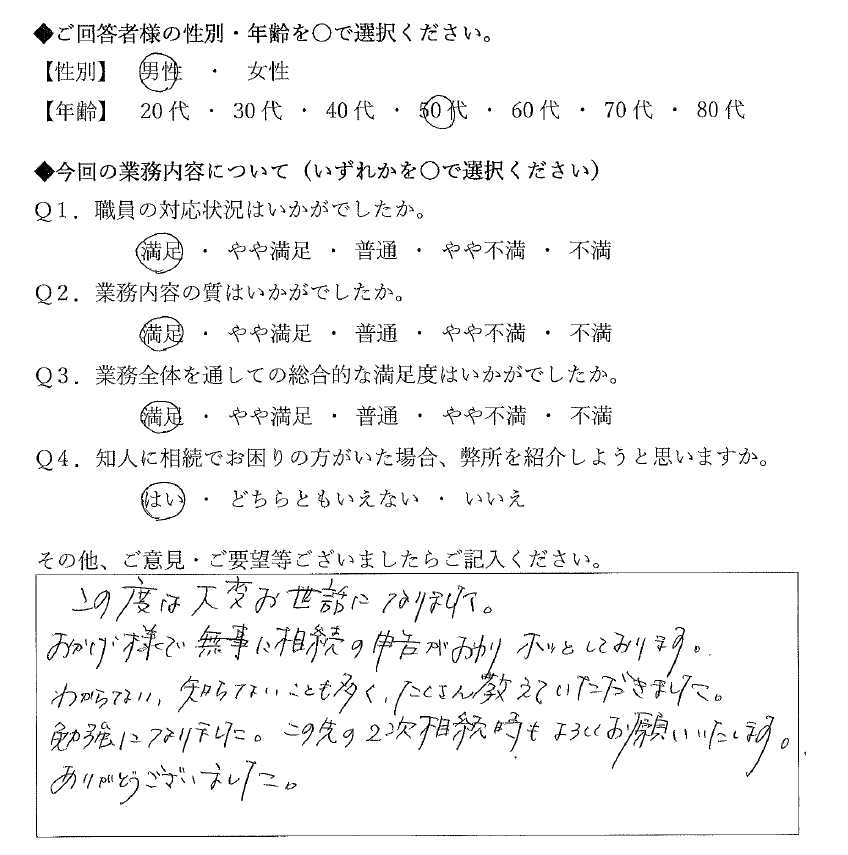 おかげ様で無事に相続の申告がおわりホッとしております。